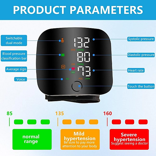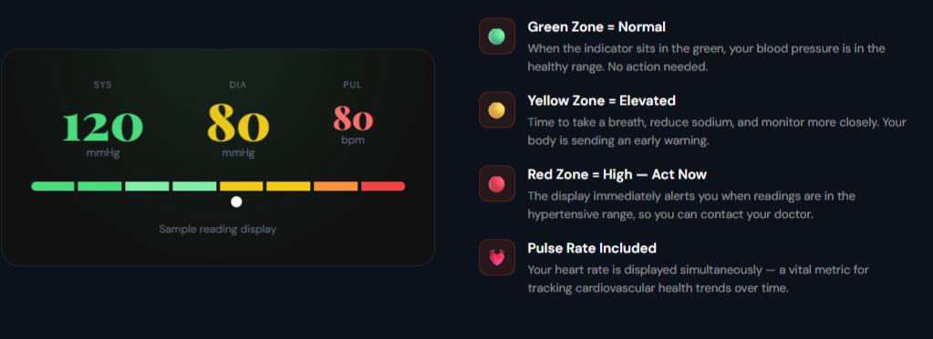 Simultaneously measures Systolic pressure, Diastolic pressure, and Pulse rate β€” three vital health indicators in one single reading.